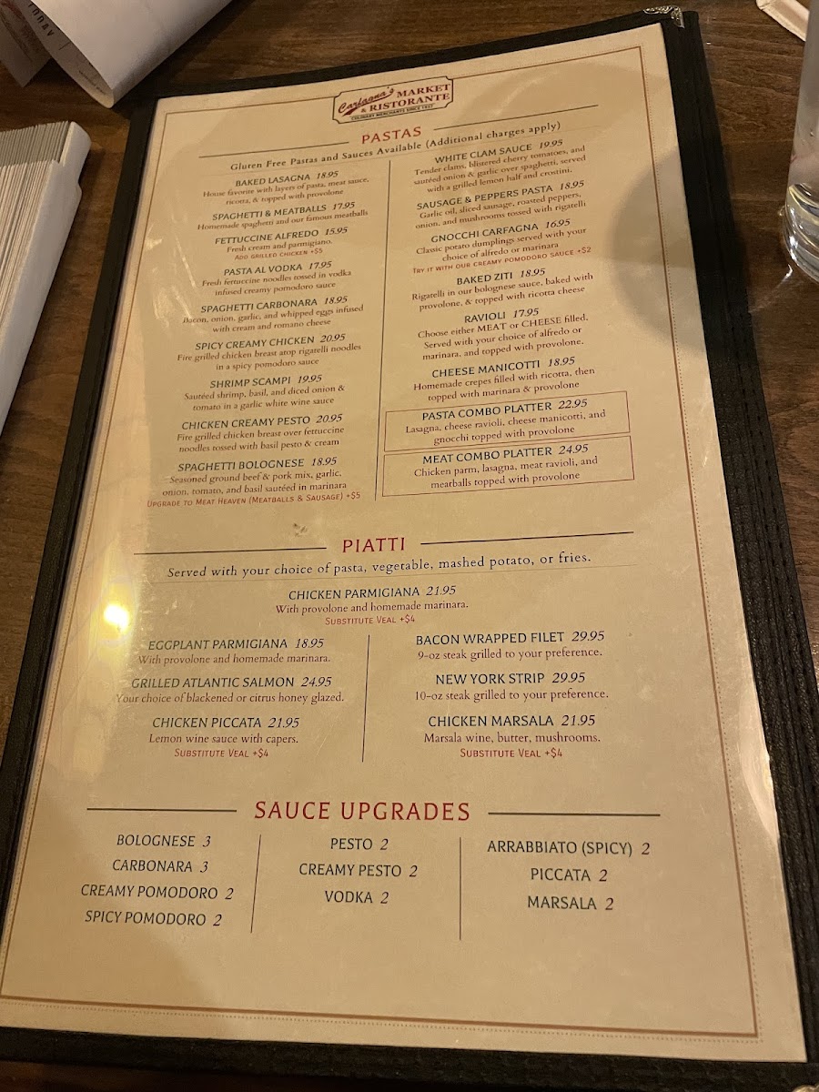 Lasagna with Marinara Sauce, Large Meat Ravioli with Alfredo Sauce, Chicken Parmesan, Carfagna's Famous Meatballs